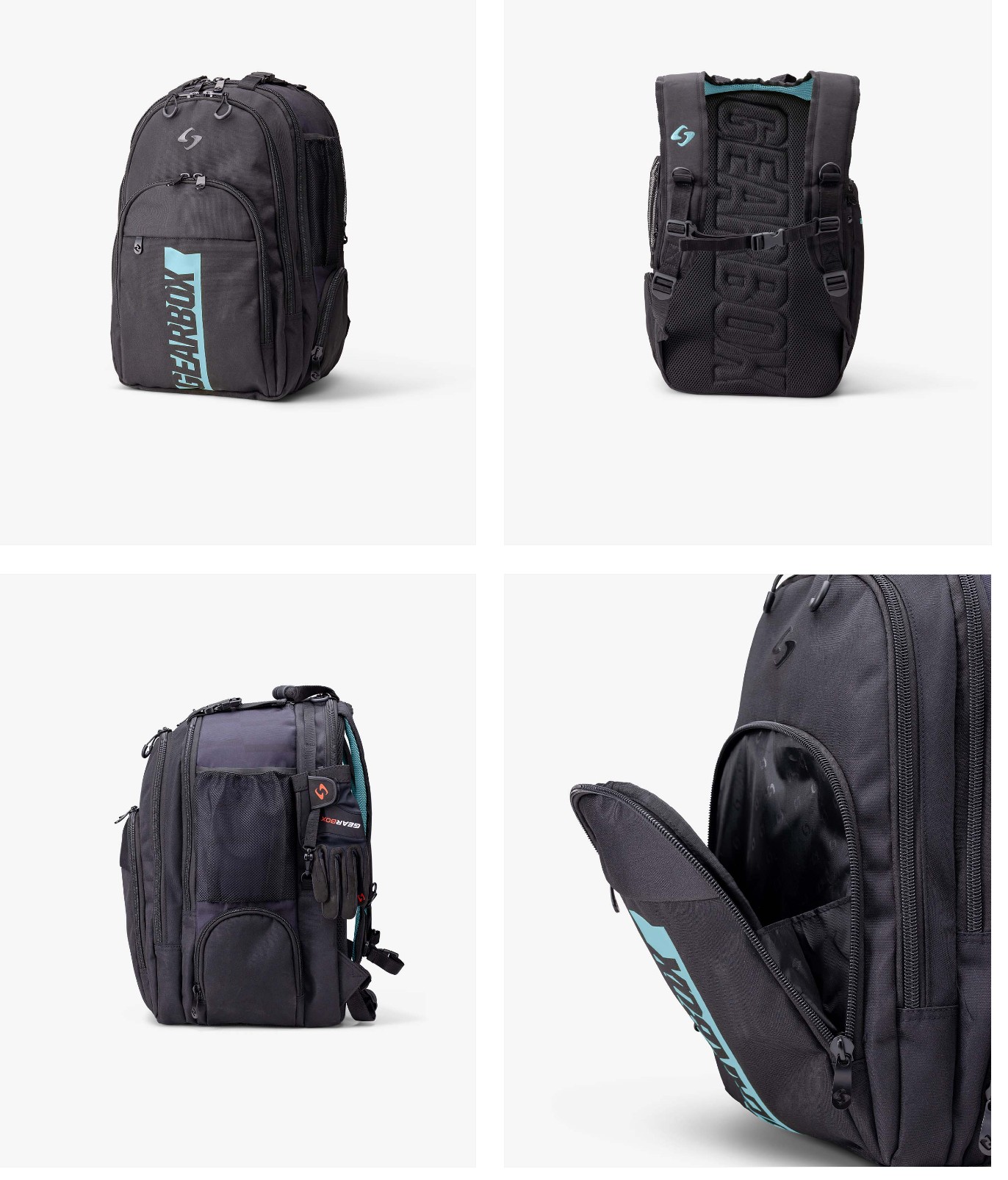 The 10th, 11th, and 12th images show the racquet pocket. This easily holds three racquets. My preferred racquet is the Gearbox GX1 170 Teardrop Blue.