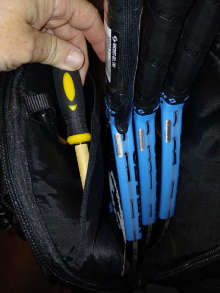 The 15th and 16th images show an awl. I carry this to push wrist-cords thru the ends of racquets when they come loose. I used to use this much more frequently when I ran the racquetball league in Marietta, Georgia. The awl fits in a small pouch at the top of the racquet compartment.