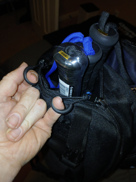 The 17th and 18th images show the reinforcements of the zippers on that racquet compartment. I like that to be very secure when traveling into and out of the gym (and when the bag is in my vehicle) so I added a carabiner to keep the zippers tight at the top.