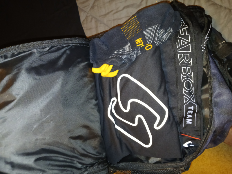 The 21st, 22nd, and 23rd images show the main clothing compartment. The shoe tunnel is visible in the bottom of this compartment and the shoes are completely separated from the clothes. There are also some internal pockets here, I am not yet using any of those for specific things. This area is big enough to hold 4-5 XXL shirts, some shorts, and extra socks. When just playing for fun, I do always take 2 court shirts. When playing a tournament, I try to take as many as I can, with a minimum of two shirts per expected match. Dry shirts make a significant mental improvement between games 1 and 2. I do also have another two gloves, two headbands, and two patella knee straps [Amazon affiliate link there, all other links are to the Gearbox website] that see use when my outside-the-court injuries re-flare while playing.